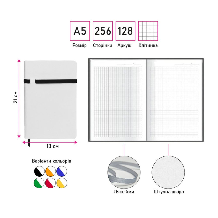 Гнучкий блокнот Alanis формату А5 на 128 аркушів у клітинку з м’якою білою обкладинкою зі штучної шкіри виглядає презентабельно та приємний на дотик. Закруглені кути, горизонтальна кольорова гумка-фіксатор і лясе в тон створюють гармонійний та практичний вигляд. Кольоровий форзац, підібраний під відтінок фіксатора, додає стильності та завершеності дизайну, а яскраві акценти ефектно контрастують із білими сторінками, роблячи блокнот сучасним і виразним. У кінці розташовано 8 чистих перфорованих аркушів для зручного використання.