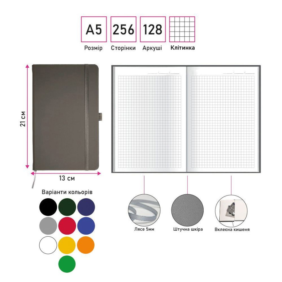Має 8 перфорованих аркушів. В закритому вигляді блокнот фіксується за допомогою вертикальної гумки-фіксатора одного кольору з палітуркою. Тверда обкладинка зі штучної шкіри.