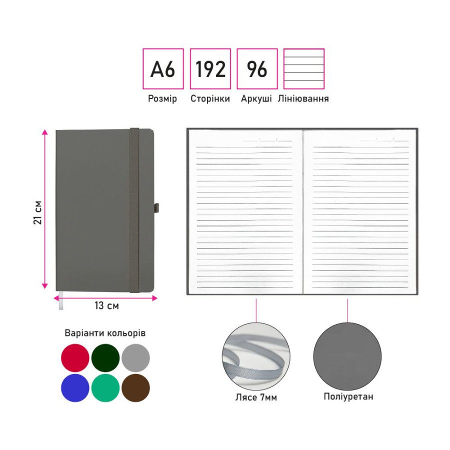 Блокнот GRACY - бізнес-блокнот у гнучкій та м'якій на дотик PU обкладинці, яка має захисне покриття від подряпин; резинка-фіксатор soft touch вертикальна та тримач для ручки.