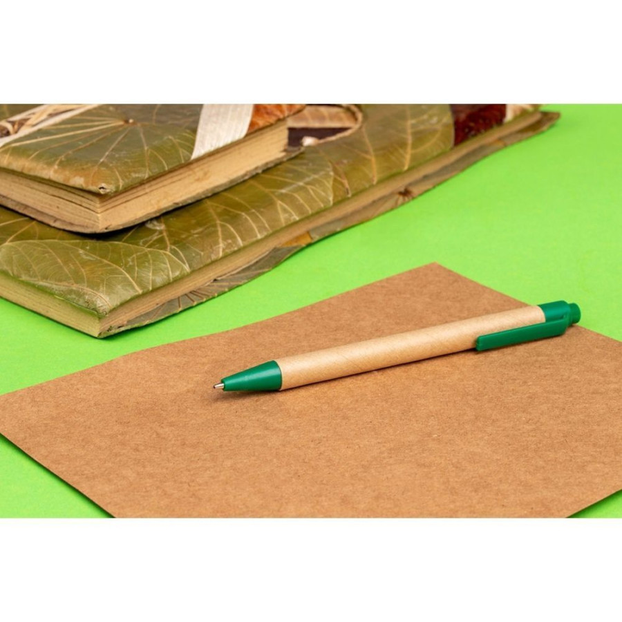 Кулькова ручка з картону із вторинної сировини. Має синій стрижень. Логотип може бути розміщений під кліпом