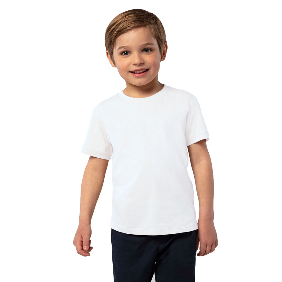 Дитяча футболка має прямий силует і круглий виріз. Горловина оброблена рібаною. Модель кроєна, з бічними швами.