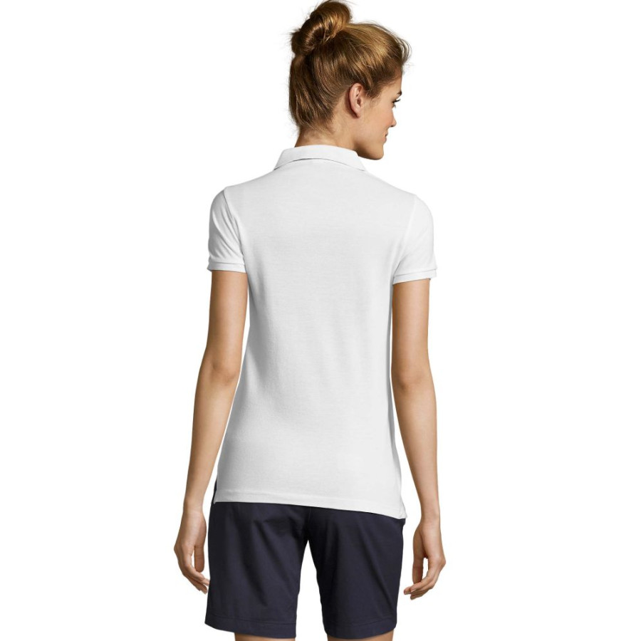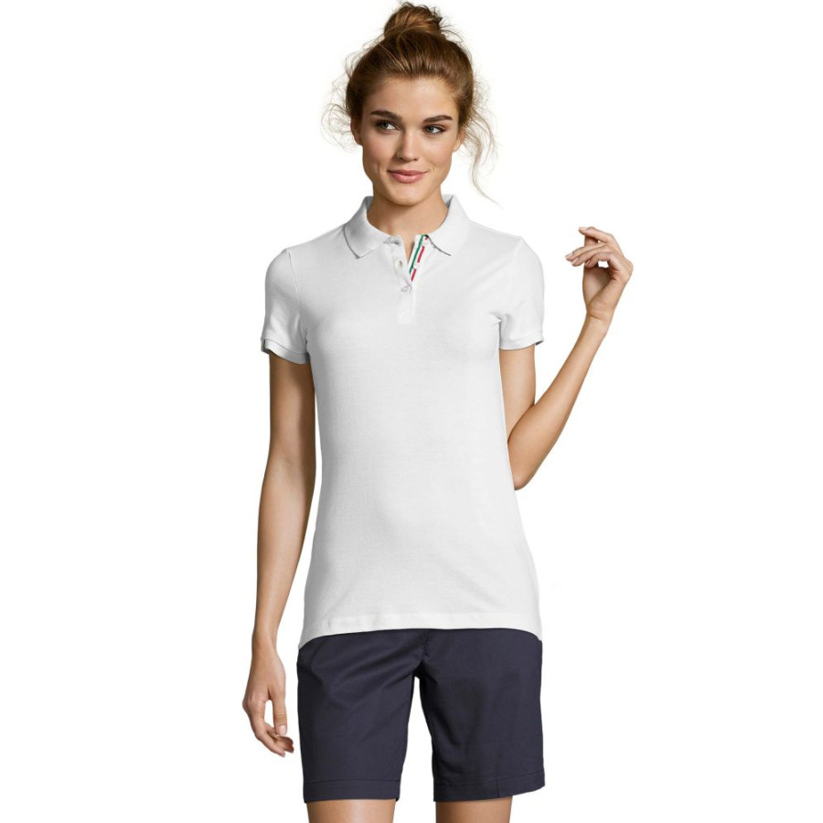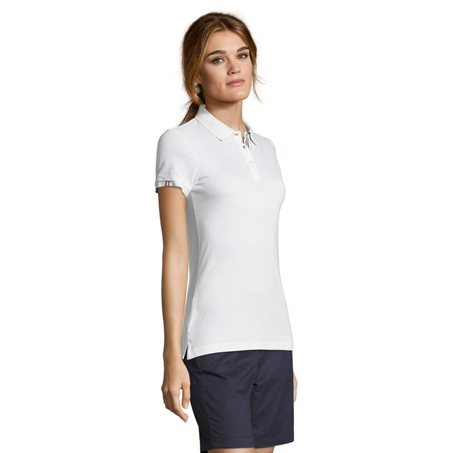 Футболка поло жіноча SOL'S PATRIOT WOMEN з коротким рукавом. Контрастна внутрішня сторона коміра. Посилена планка з двома білими перламутровими ґудзиками, контрастна смужка на планці і на внутрішній тасьмі по коміру. Декоративна двоколірна вставка на зовнішній стороні рукава і на бічних розрізах по низу вироба (зсередини). Виріб викроєн з трикотажного полотна. Приталений крій. Запасний ґудзик на внутрішньому боковому рядку вироба.