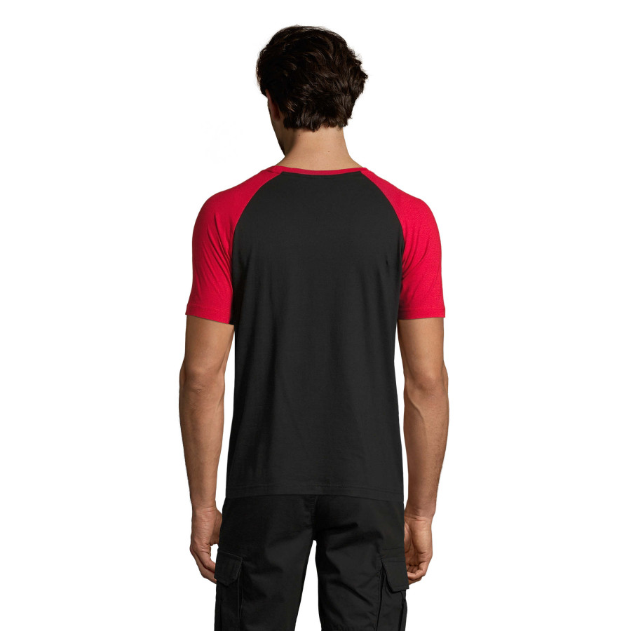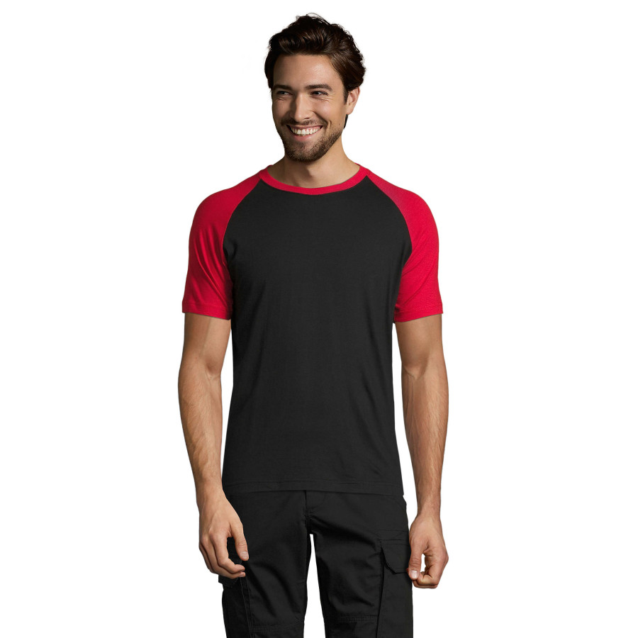 Чоловіча футболка FUNKY з рукавом реглан. Комір зв'язаний рібом з додаванням еластану, зміцнююча тасьма по коміру. Виріб викроєн з трикотажного полотна, без бічних швів.