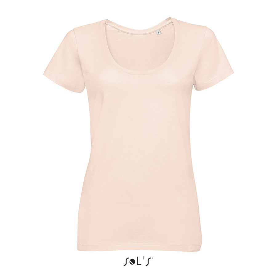 Жіноча футболка з глибоким круглим вирізом METROPOLITAN. Глибокий виріз оброблений резинкою. Короткий рукав. Зміцнююча тасьма по коміру. Кроєний трикотаж, приталений силует. 100% полугребенна бавовна Ringspun Джерсі 150 г / м².