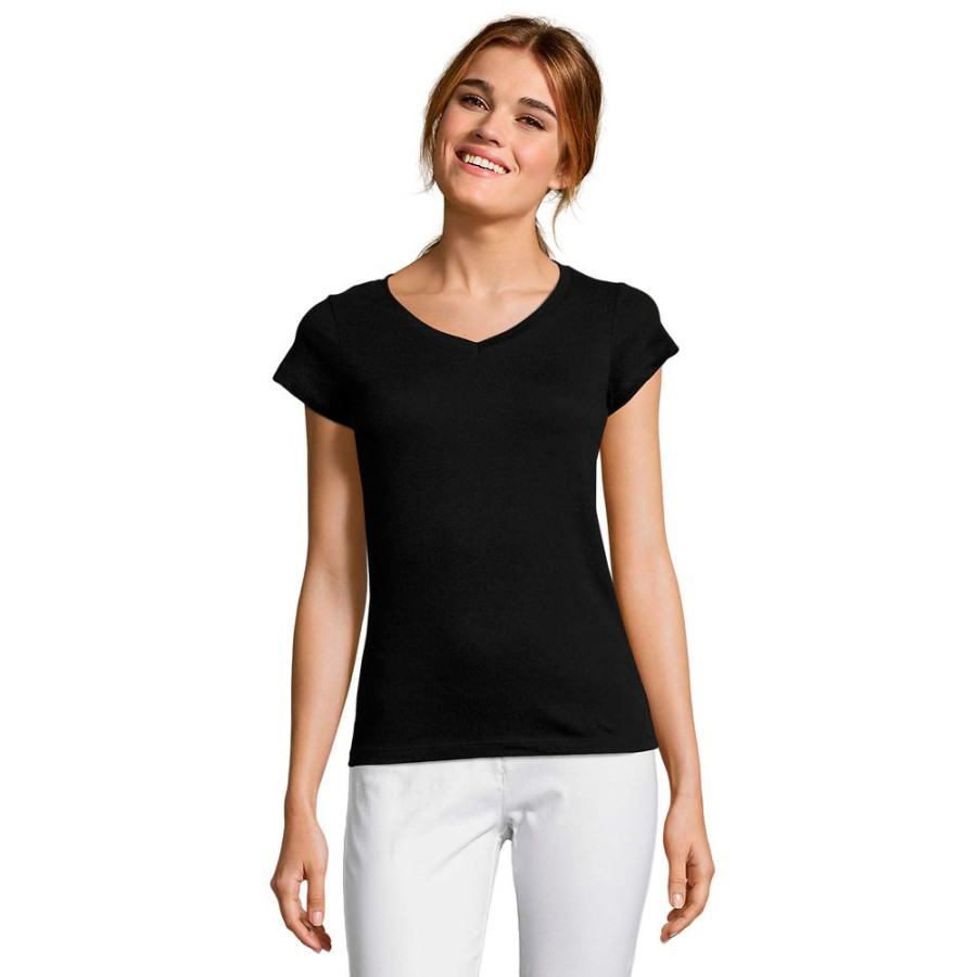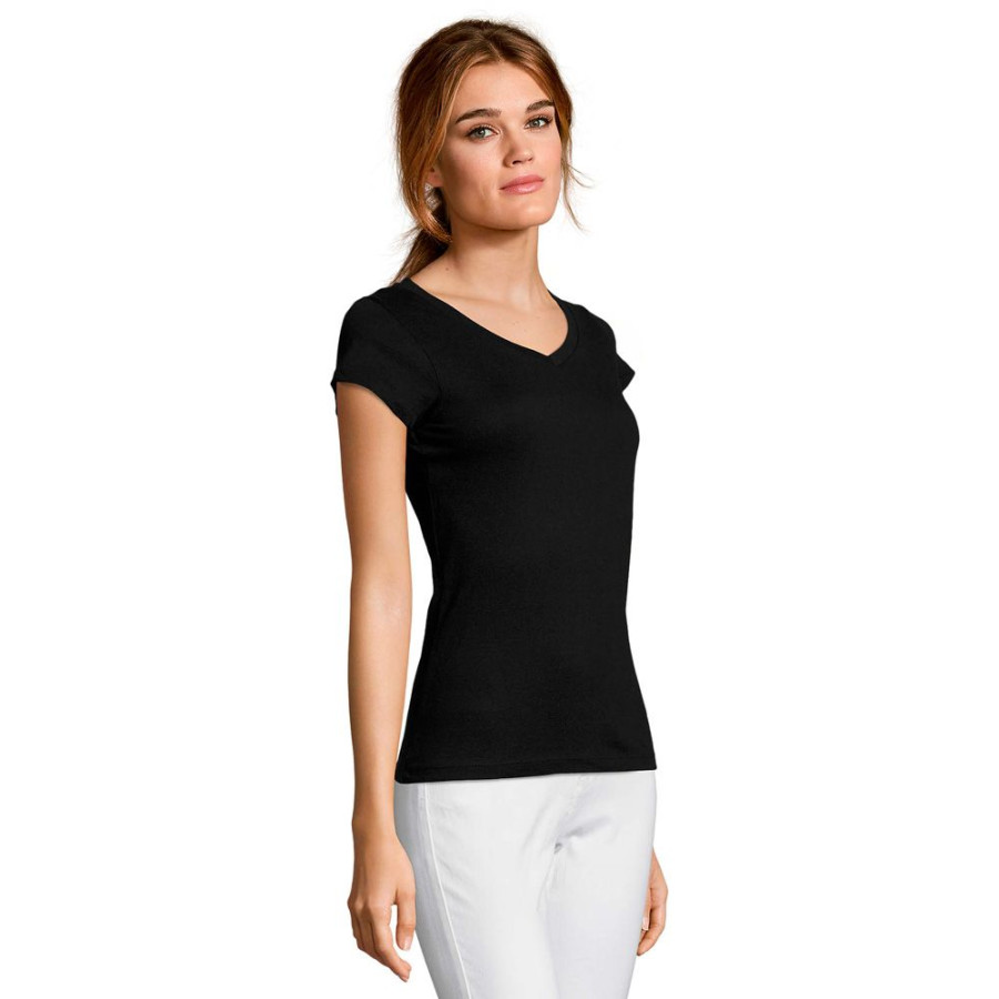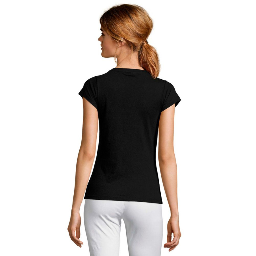 Жіноча футболка MOON з V-подібним вирізом. Виріз оброблений рібом, зміцнююча тасьма по коміру. Виріб викроєн з трикотажного полотна. Приталена модель.