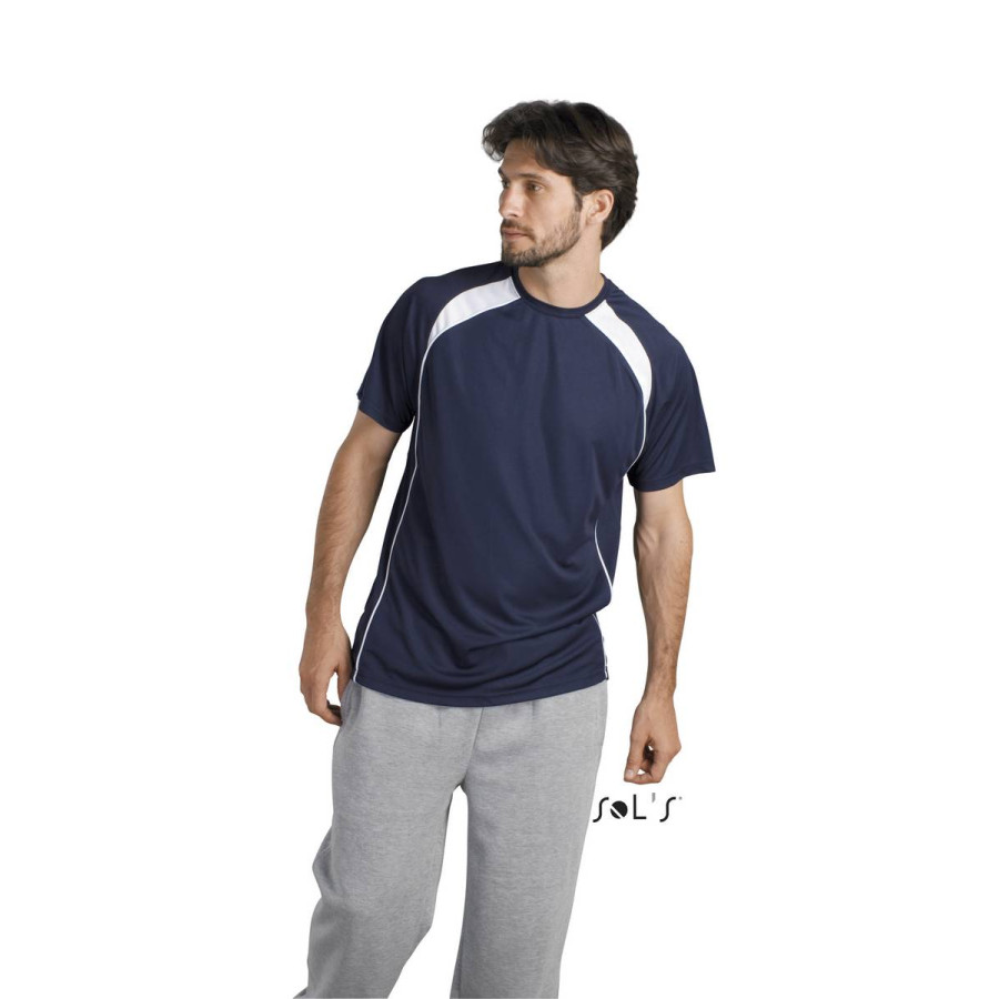Футболка чоловіча двоколірна SOL'S MATCH. Стиль: спортивний. Контрастні рукава реглан, обробка ворота і канти. Матеріал: ІНТЕРЛОК поліестер 140, 100% повітропроникний поліестер. Варіант поло: PALLADIUM - 11418, стор.53.