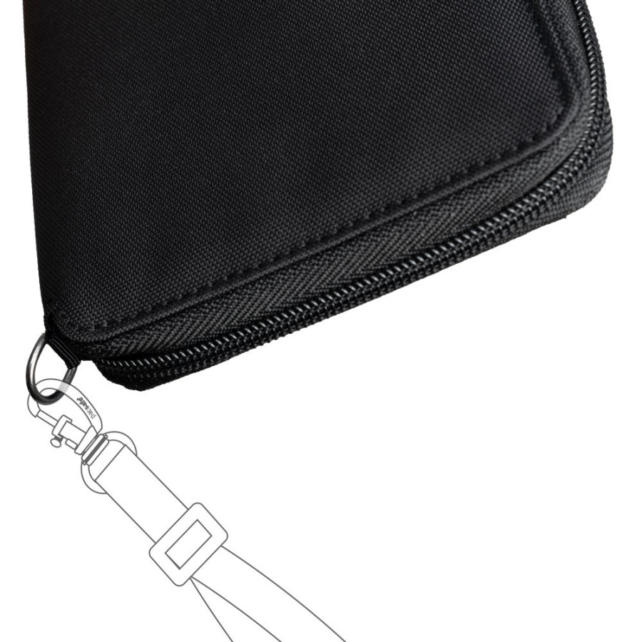 Гаманець має відділення для валют, кишеню на блискавці для монет, кільце для кріплення ключів, петлю для ручки, 8 слотів для карток і місце кріплення стійкого до порізів ремінця. Ремінець не йде в комплекті, продається окремо.