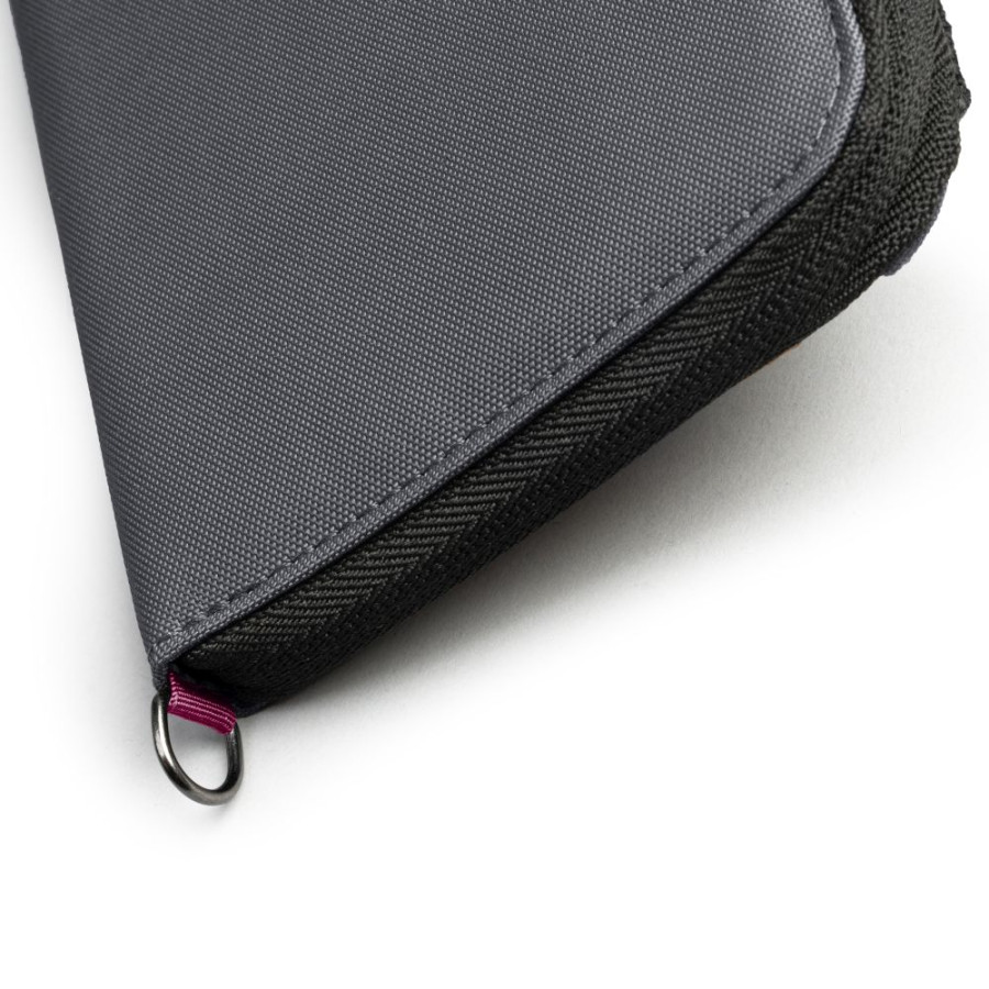 Гаманець має відділення для кількох валют, місце для посадкового талона, кишеню для монет, сітчасту кишеню для дрібних речей, петлю для ручки, 5 слотів для карток і місце кріплення стійкого до порізів ремінця, який продається окремо.