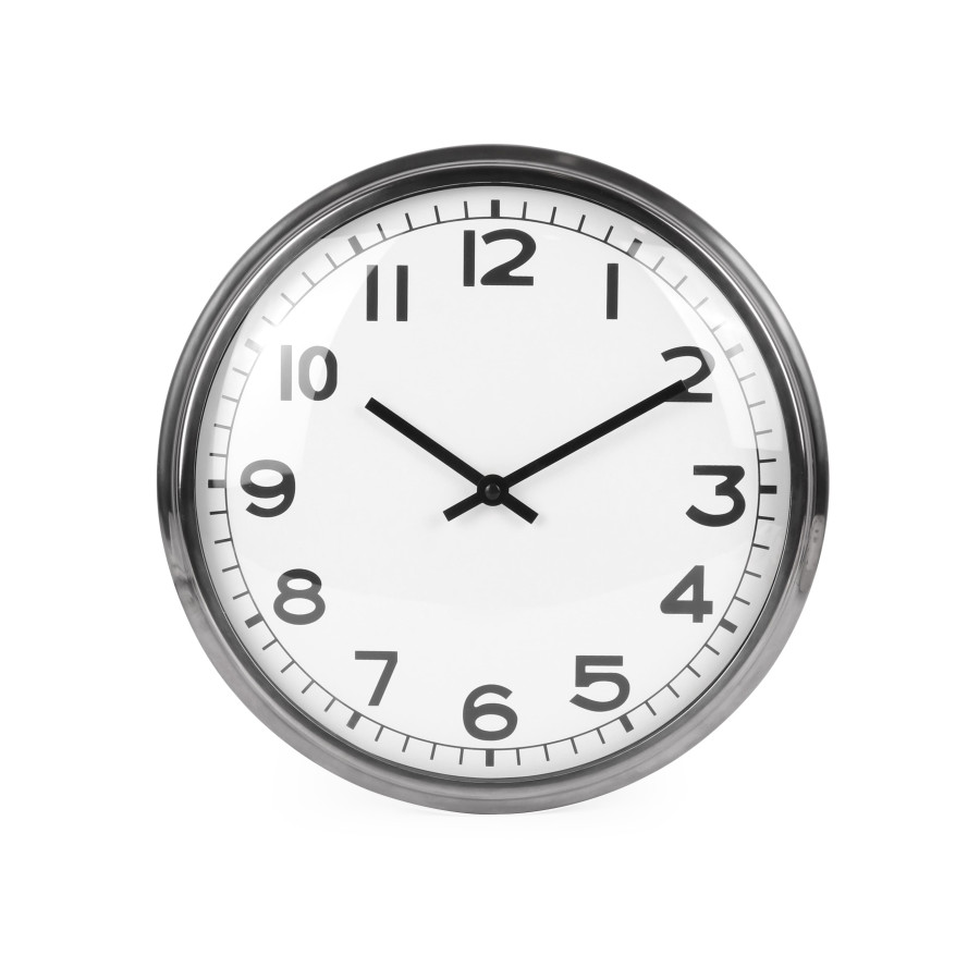 Настінний годинник з металевим обідком сріблястого кольору з чорнобілим циферблатом.