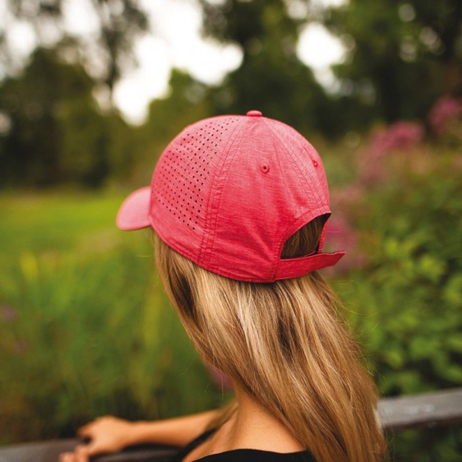 Кепка має шість клинів з люверсами, оздобленими вишивкою, та бокові панелі з перфорацією для кращої повітропроникності.