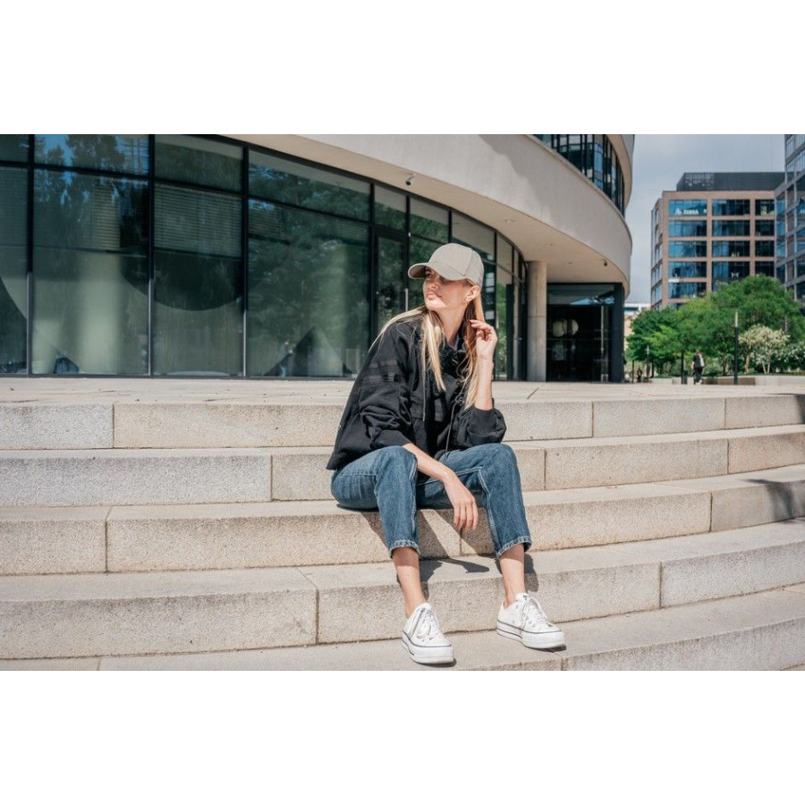 Кепка має низький профіль, шість панелей і зручну застібку на липучці, що дозволяє легко регулювати об’єм для ідеальної посадки. Люверси оздоблені вишивкою в тон основного матеріалу.
