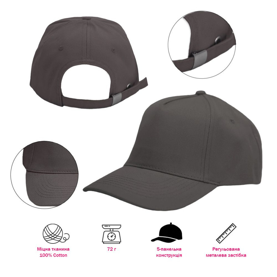 Модель виконана у форматі 5-клинки та має 6 декоративних стібків на козирку. Завдяки продуманій конструкції головний убір добре зберігає форму. Кепка оснащена чотирма люверсами з вишивкою в тон виробу, які одночасно виконують функцію вентиляційних отворів