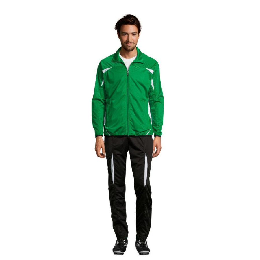 Тренувальний костюм SOL'S CAMP NOU. Куртка, пояс і манжети оздоблені еластичною діагональною резинкою. Передня застібка і кишені на блискавці. Великі контрастні перфоровані вставки з боків і на рукавах гарантують оптимальну повітропроникність. Матеріал: Інтерлок, поліестер 100%.