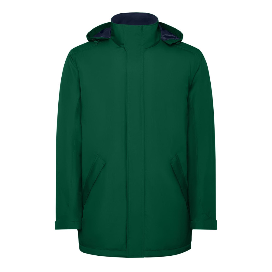 Пухова куртка-парка з від'єднуваним капюшоном та еластичними регуляторами. Водонепроникний матеріал. Спереду блискавка, що прикрита широкою планкою з того ж матеріалу. Манжети з регулятором на липучці. Бічні кишені з відповідними блискавками, прикриті планкою з тканини. Внутрішня кишеня ліворуч. Внутрішній доступ для персоналізації.