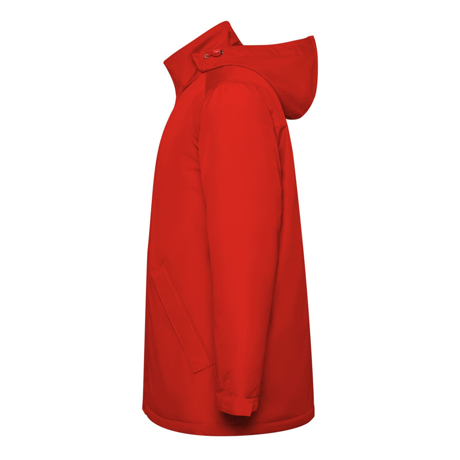 Пухова куртка-парка з від'єднуваним капюшоном та еластичними регуляторами. Водонепроникний матеріал. Спереду блискавка, що прикрита широкою планкою з того ж матеріалу. Манжети з регулятором на липучці. Бічні кишені з відповідними блискавками, прикриті планкою з тканини. Внутрішня кишеня ліворуч. Внутрішній доступ для персоналізації.