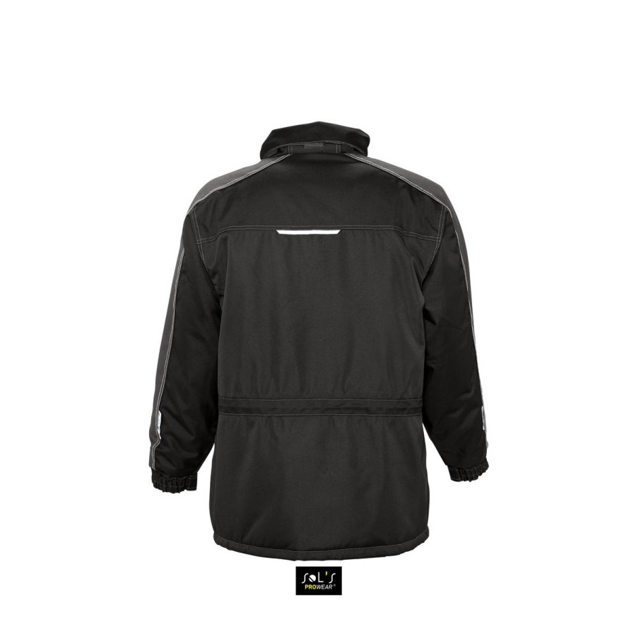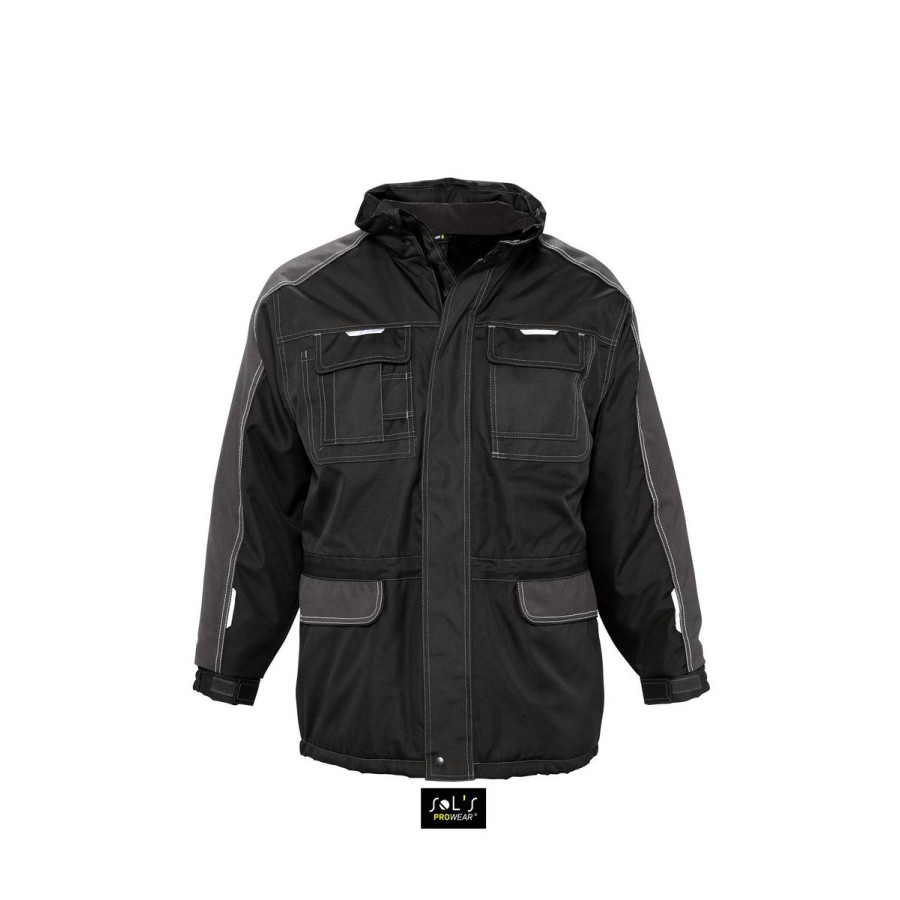 Куртка SOL'S FUSION PRO. Капюшон, що складається в комір, застібка з планкою, лита блискавка в тон і кнопки, світловідбиваючі вставки на нагрудних кишенях, манжетах і на спині; контрастна обробка: на плечах, рукавах і клапанах кишень еластичні манжети на липучці, 8 кишень. Матеріал: ОКСФОРД 600D.
