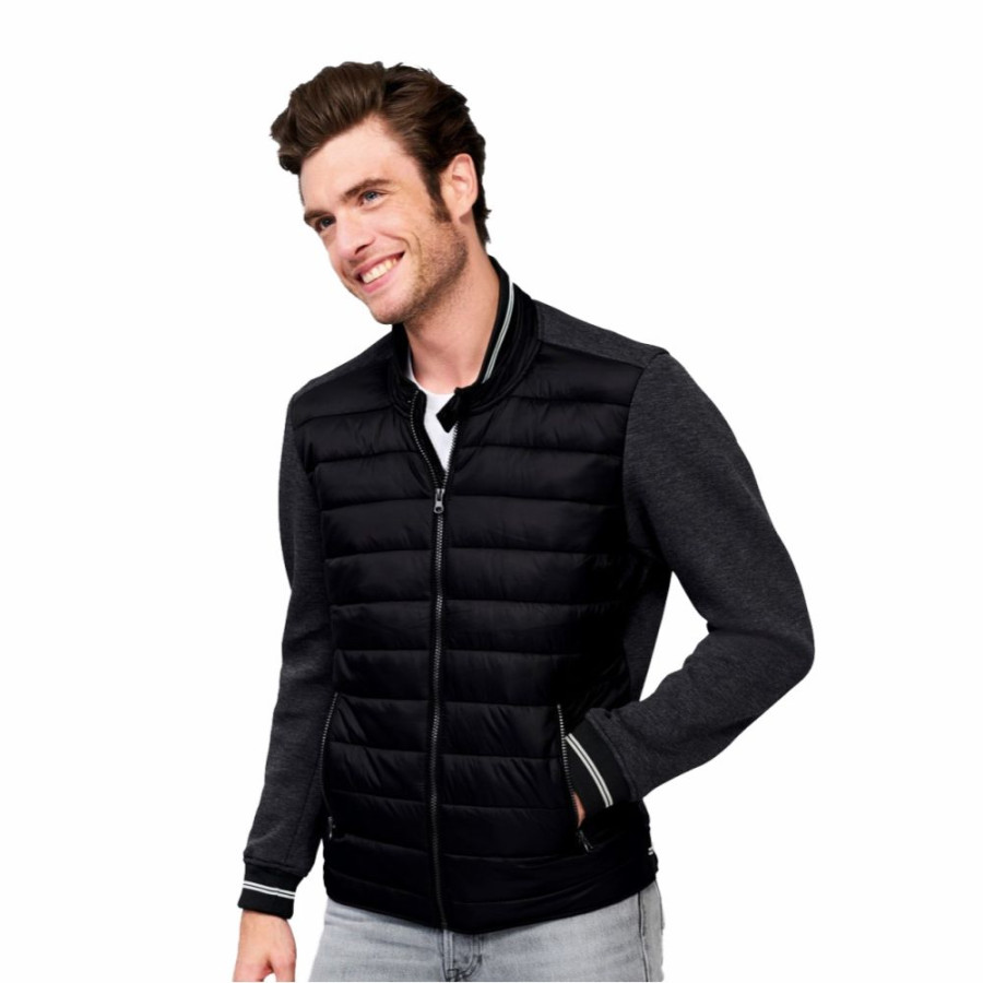 Курточка унісекс з неопрена і нейлоновим набиванням спереді.Круглий воріт, дві кишені на блискавці. Воріт, манжети і низ спинки оброблений рібом з контрасними лініями.