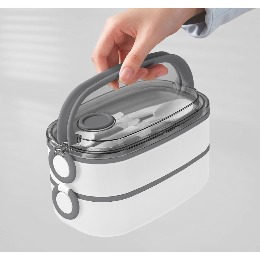 Компактний ланч бокс з двома відділеннями, має прозору кришку, яка герметично закривається. Посудини з високоякісної нержавіючої сталі в подарунковій картонній коробці. Розмір індивідуальної коробки: 21,7 х 12,5 х 12,5 см.