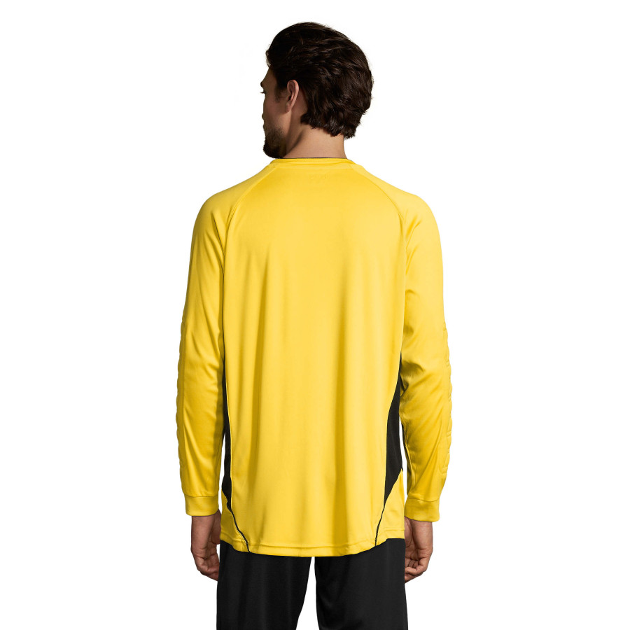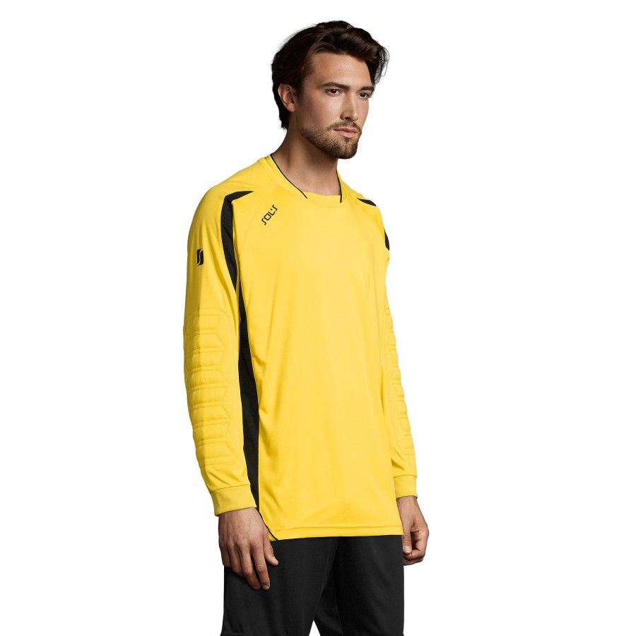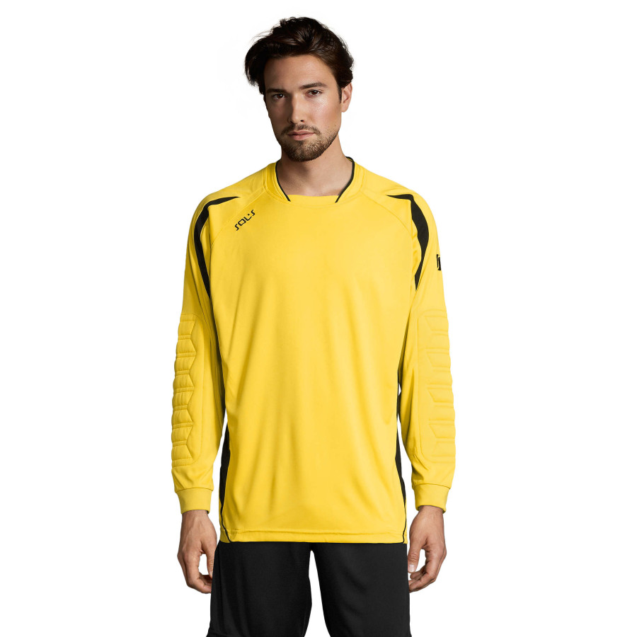 Футболка воротаря SOL'S AZTECA. Рукав реглан. Контрастні перфоровані вставки з боків і на рукавах. Вишитий контрастною ниткою логотип. Довгий рукав з манжетами в резинку і налокітники для захисту від ударів. Подовжена спинка з заокругленням по низу. Матеріал: ІНТЕРЛОК 140, гладкий поліестер 100%. Питома вага: 140 г / кв.м. Підходить для друку сублімації.