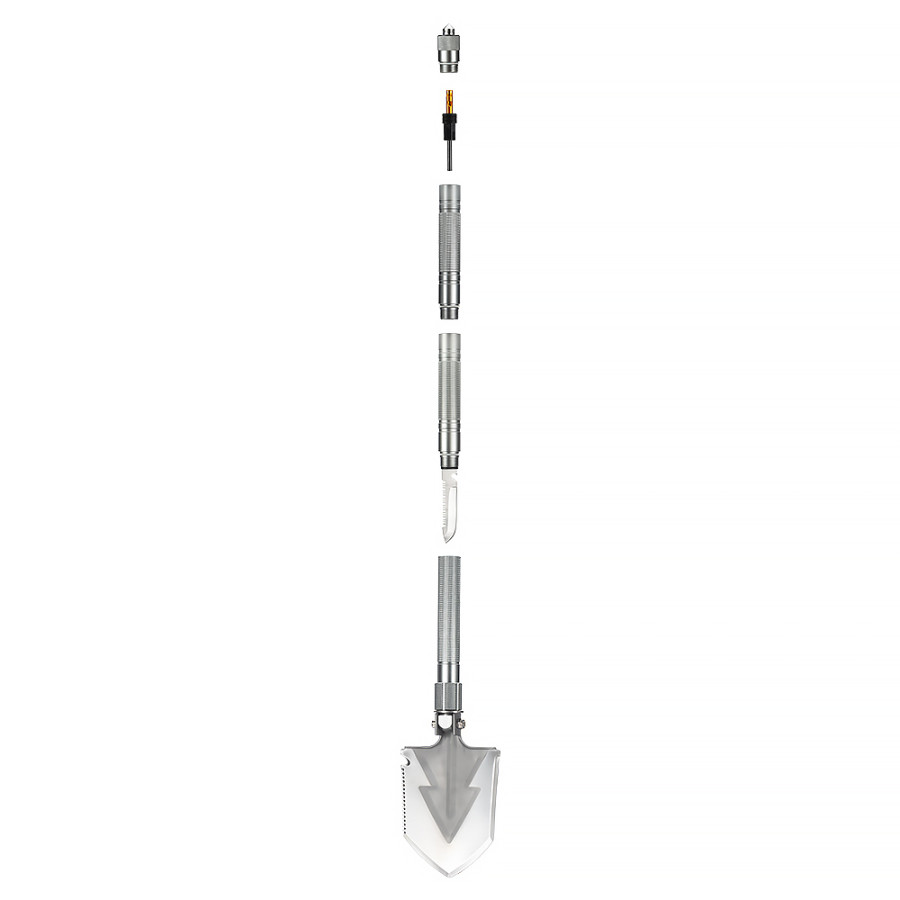 Багатофункціональна лопата для застосування у туризмі. Включає 15 функцій, у тому числі ніж, свисток, викрутка, склобій. Виготовлена з міцних та зносостійких матеріалів, нержавіюча сталь 20cr13 і високоміцний алюміній 6061-T6,зручної конструкції, легко упаковувати, зберігати та переносити. Витримує значні механічні навантаження. Довжина лопати складає 1 метр.