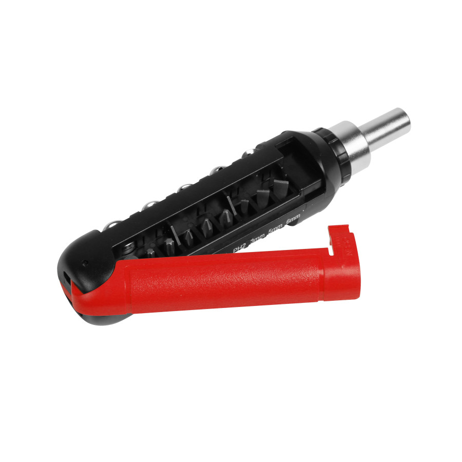 Викрутка виготовлена з АБС пластику та високоякісної сталі. В комплект викрутки входить магнітний тримач, 9 біт (один адаптор - ADP, два шестигранник - Т15, Т20, три плоскі - 3 мм., 5 мм.,6 мм., три хрестові - PH0, PH1, PH2) а також 5 головок торцевих ключів (6 мм., 7 мм., 8 мм., 9 мм, 10 мм.) Упакована в індивідуальну чорну подарункову коробку та поліетиленовий пакет. Розмір в складеному стані 16,5 см.
