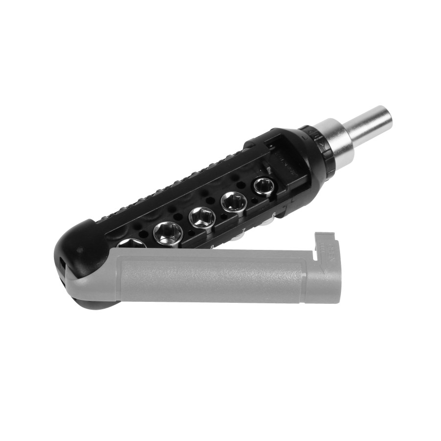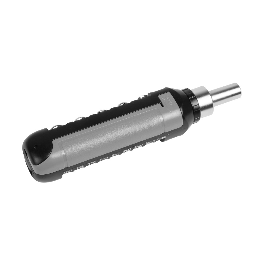 Викрутка виготовлена з АБС пластику та високоякісної сталі. В комплект викрутки входить магнітний тримач, 9 біт (один адаптор - ADP, два шестигранник - Т15, Т20, три плоскі - 3 мм., 5 мм.,6 мм., три хрестові - PH0, PH1, PH2) а також 5 головок торцевих ключів (6 мм., 7 мм., 8 мм., 9 мм, 10 мм.) Упакована в індивідуальну чорну подарункову коробку та поліетиленовий пакет. Розмір в складеному стані 16,5 см.