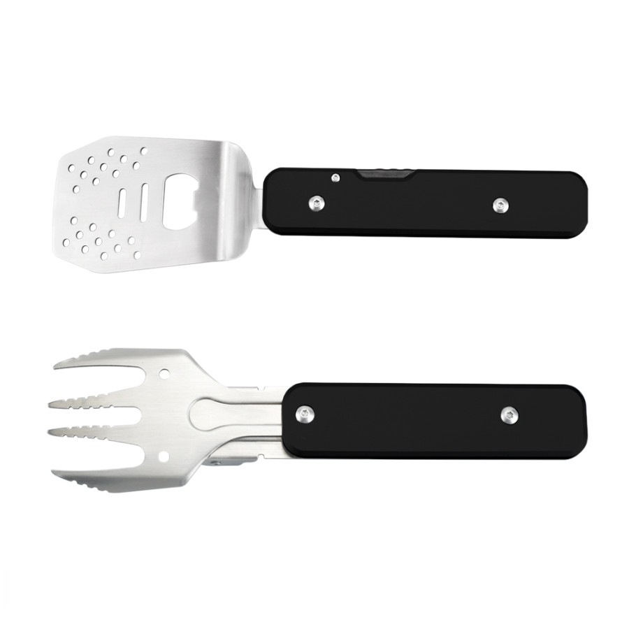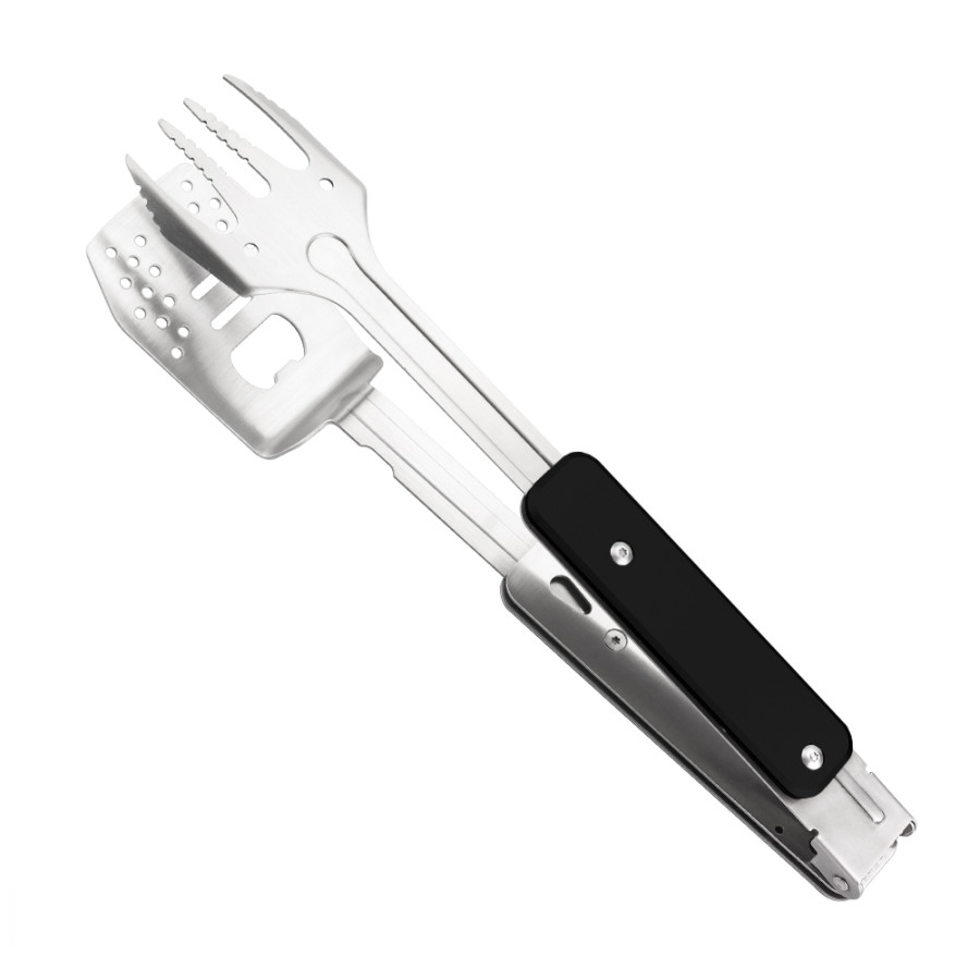 Багатофункціональний набір для барбекю, виконаний з нержавіючої високоякісної сталі. Трансформується в усі необхідні інструменти для приготування страв на вогні: вилка для грилю, лопатка, щипці, відкривачка. Вага 268,2 грама.