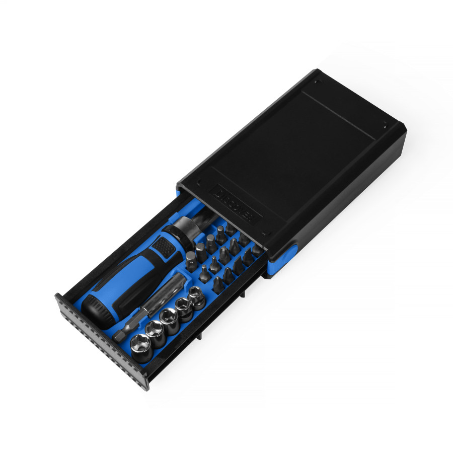 Набір з високоякісної сталі в компактній, пластиковій коробці, яка оригінально відкривається натиском на кнопку. В комплект входить 25 шт інструментів: