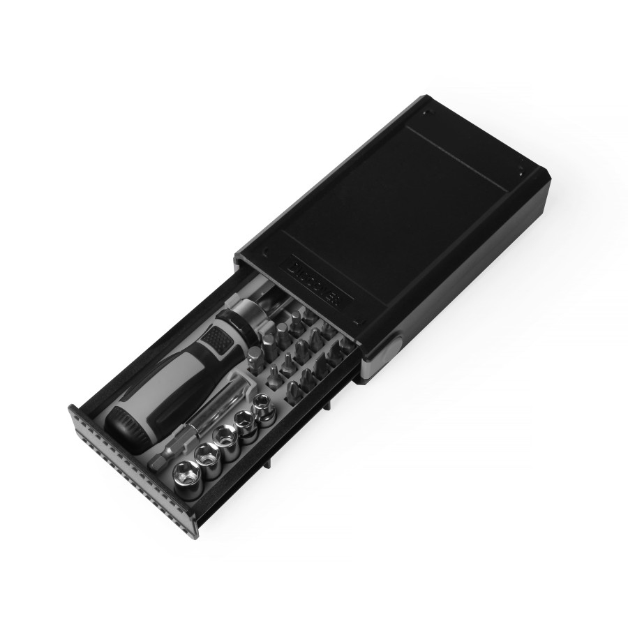 Набір з високоякісної сталі в компактній, пластиковій коробці, яка оригінально відкривається натиском на кнопку. В комплект входить 25 шт інструментів: