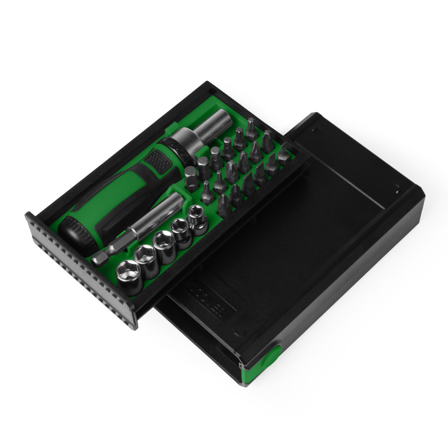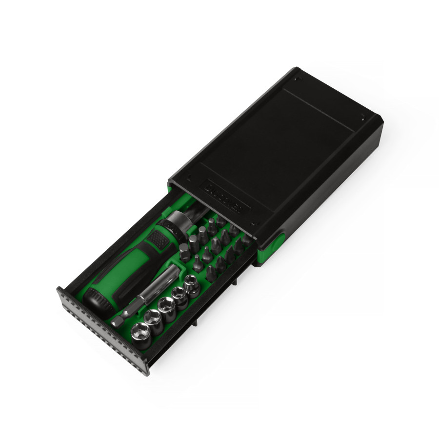 Набір з високоякісної сталі в компактній, пластиковій коробці, яка оригінально відкривається натиском на кнопку. В комплект входить 25 шт інструментів: