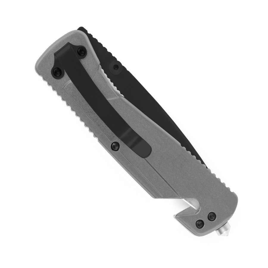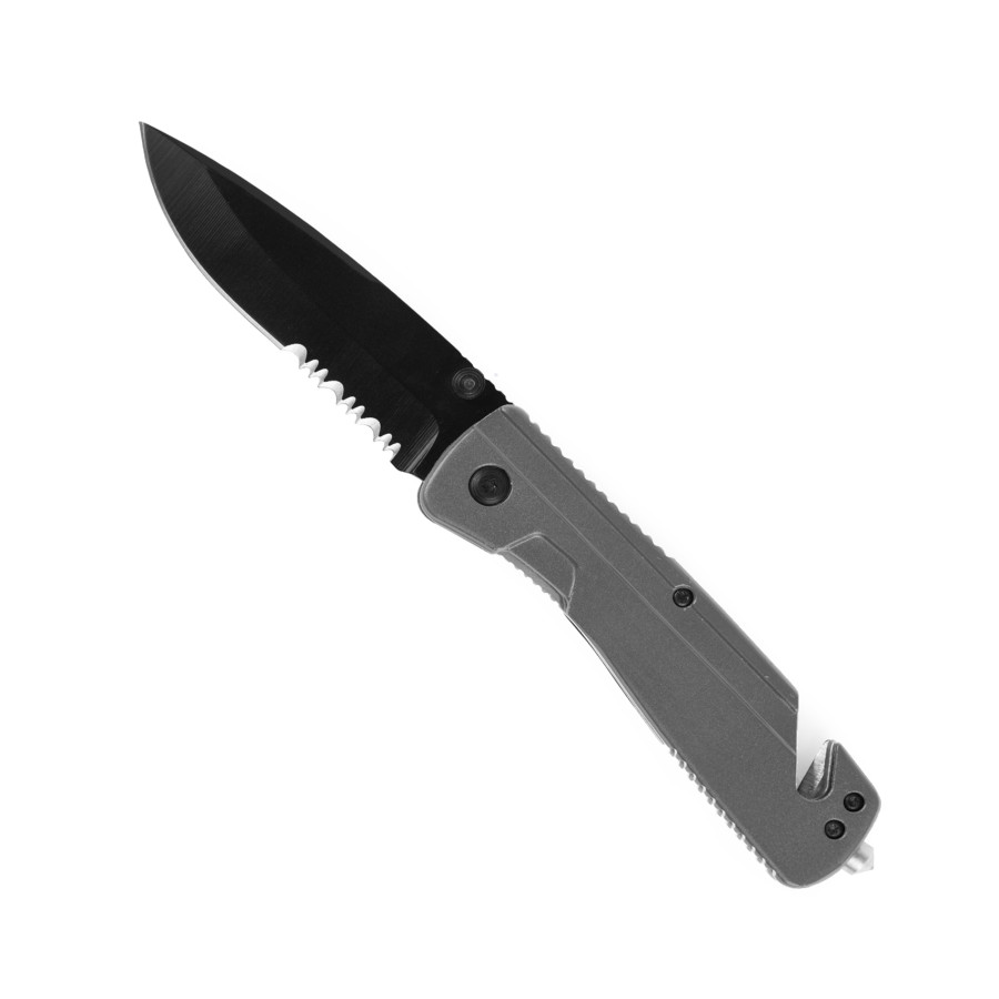 Ніж з високоякісної нержавіючої сталі, гострим лезом з фіксатором, кліпсою для чіпляння на ремінь. Має такі додаткові безпекові функції: - Стержень для вибивання і розбивання скла в автомобілі у випадку аварії якщо закриті або заблоковані двері. Ця функція може врятувати вам життя. - Подвійне приховане лезо для легкого обрізання реміня безпеки якщо заклинило реміневий механізм. Упаковка елегантна чорна коробка. Розмір в складеному стані 11,5 см., у відкритому 20,1 см.