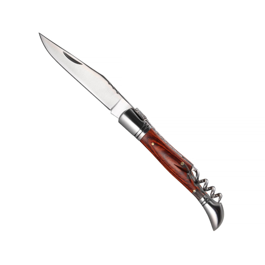 Ніж з високоякісної нержавіючої сталі, гострим лезом, має штопор. Тримач з дерев'яними вставками. Розмір леза 9 см, розмір в закритому стані 11,8Х2,5Х1,7 см.