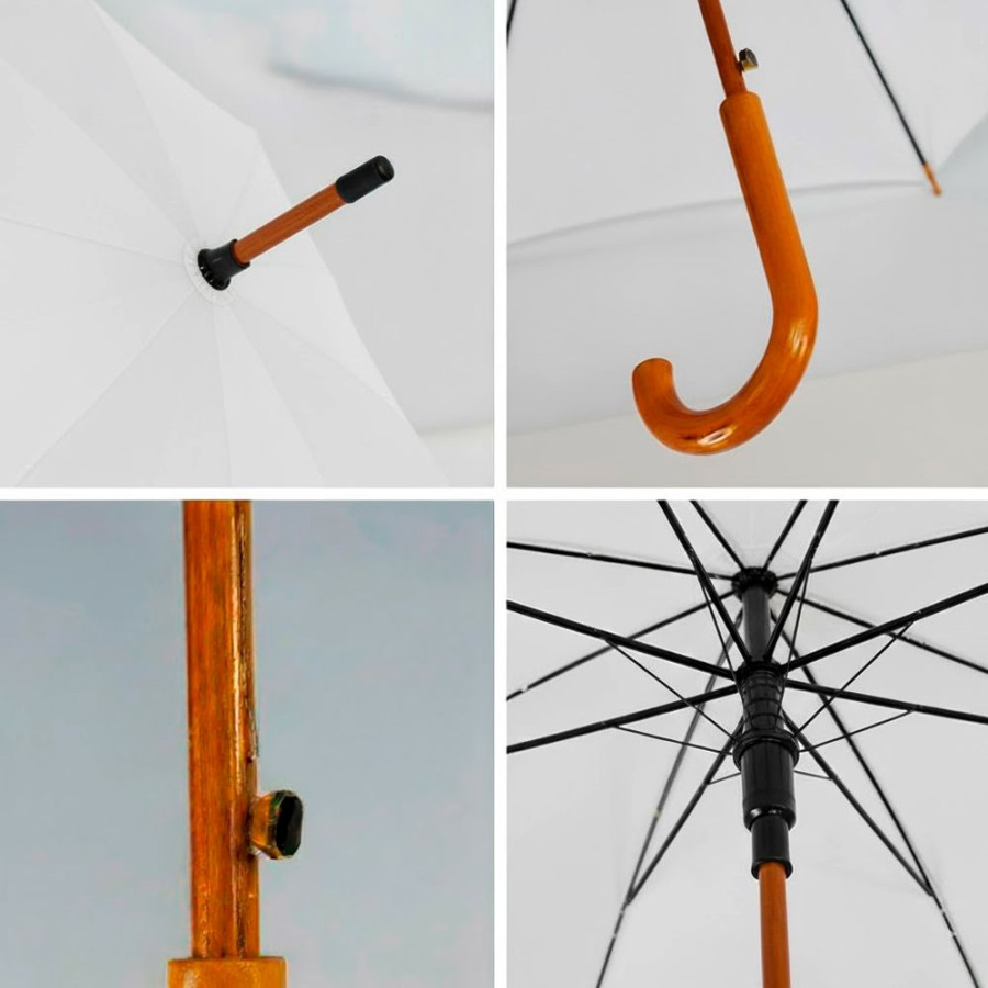 Парасолька має форму тростини. Її вигнута ручка й стрижень (основа) зроблені з натурального дерева, тому виріб досить легкий. Функція автовідкриття сприяє швидкому розгортанню купола.