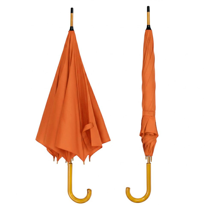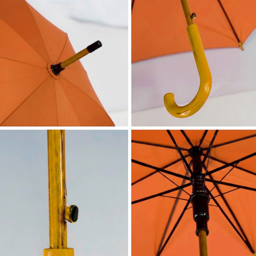 Парасолька має форму тростини. Її вигнута ручка й стрижень (основа) зроблені з натурального дерева, тому виріб досить легкий. Функція автовідкриття сприяє швидкому розгортанню купола.