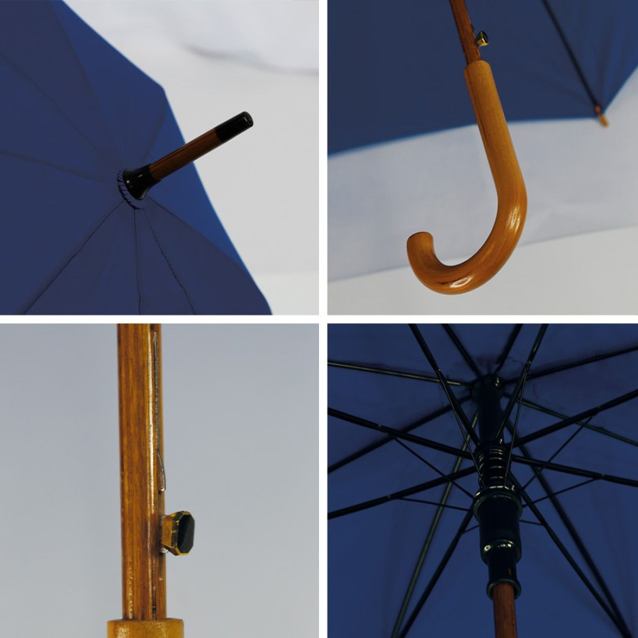 Парасолька має форму тростини. Її вигнута ручка й стрижень (основа) зроблені з натурального дерева, тому виріб досить легкий. Функція автовідкриття сприяє швидкому розгортанню купола.