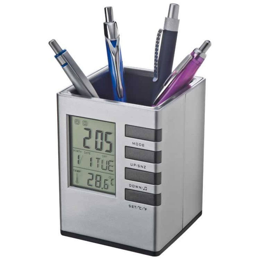 Практичний та зручний офісний набір із місцем для письмових приборів та електронним годинником з показниками дат та температур. Виготовлен з прочного пластику. Продукт містить батареї.