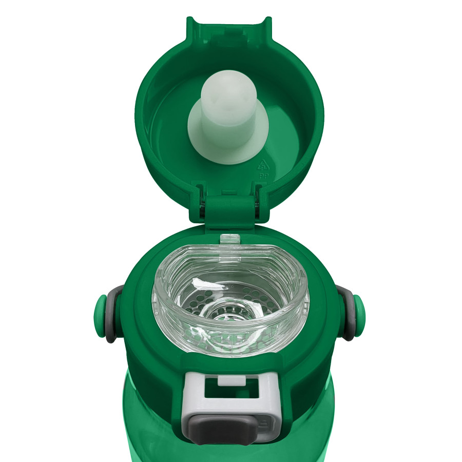 Пляшка для пиття 640 мл., матеріал пластик (BPA FREE), кришка з надійним відкидним механізмом, яка відкривається та блокується флеш-кнопкою, має силіконову ручку, яку зручно тримати або переносити пляшку, в середині кришки вмонтовано з'ємне ситечко з нержавіючої сталі . Группа нанесення шовкодрук, уф-друк. Розмір: висота 22 см., діаметр колби 7 см. Індивідуальна картонна подарункова коробка. Розмір індивідуальної коробки: 22,6 х 9 х 8 см.
