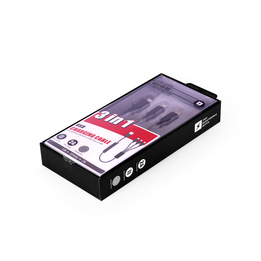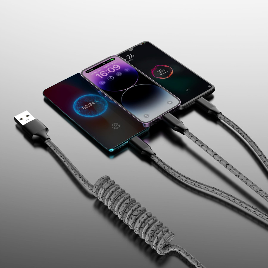 Універсальний кабель 3-в-1 для зарядки гаджетів, довжина в розтягнутому стані 1,2 м. Має стандартний USB вхід для підключення живлення та три різні виходи Lightning + Mscro USB + Type-C.