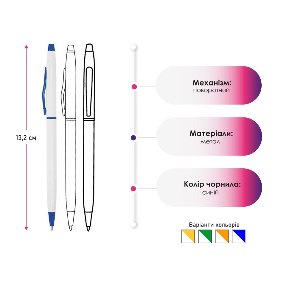 Акуратна металева ручка з глянсовою білою поверхнею і кольоровими елементами. Колір гравірування - срібло.