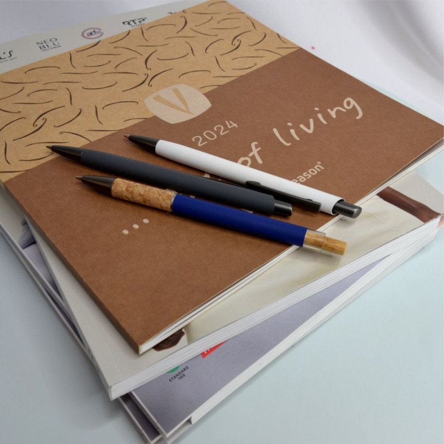 Корпус ручки виготовлений з алюмінію, зверху – кольорове покриття Soft touch. Виріб має пластикову кнопку.