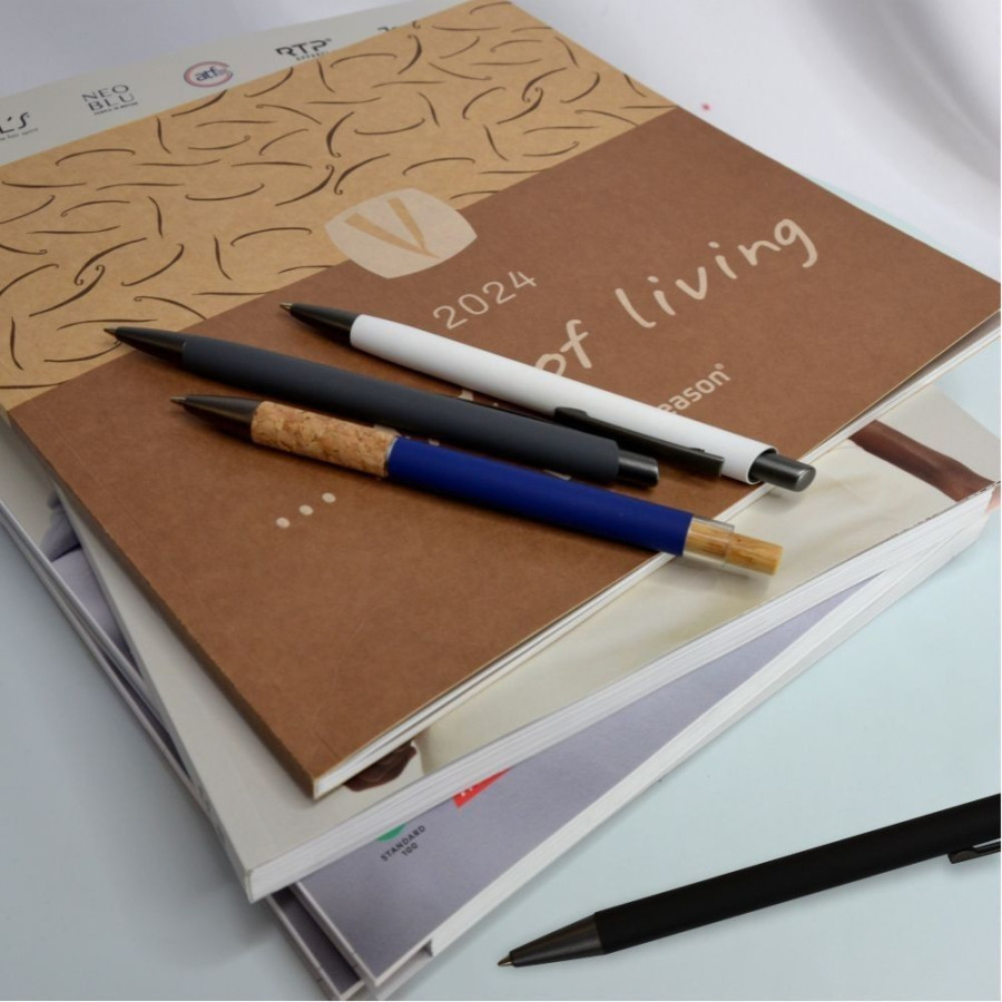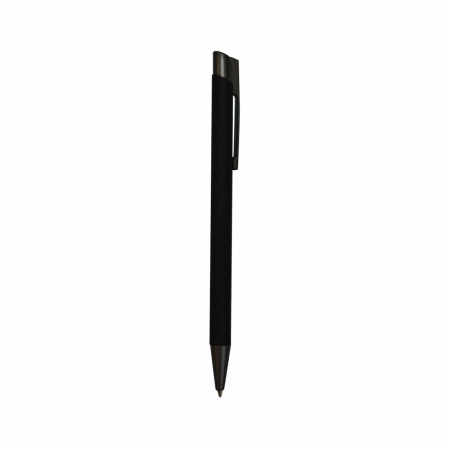 Корпус ручки виготовлений з алюмінію, зверху якісне покриття Soft touch. Виріб має кнопку та наконечник сірого кольору.