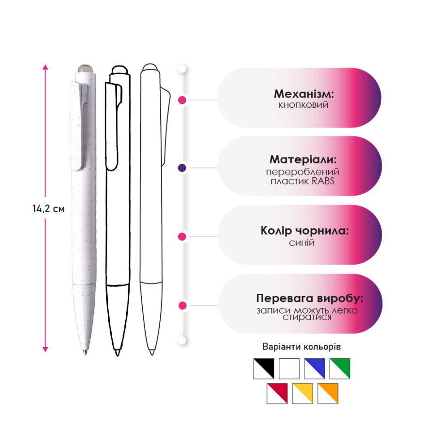 Корпус ручки виготовлений з твердого переробленого пластику RABS.