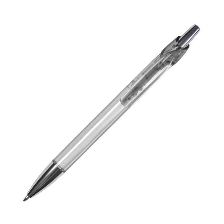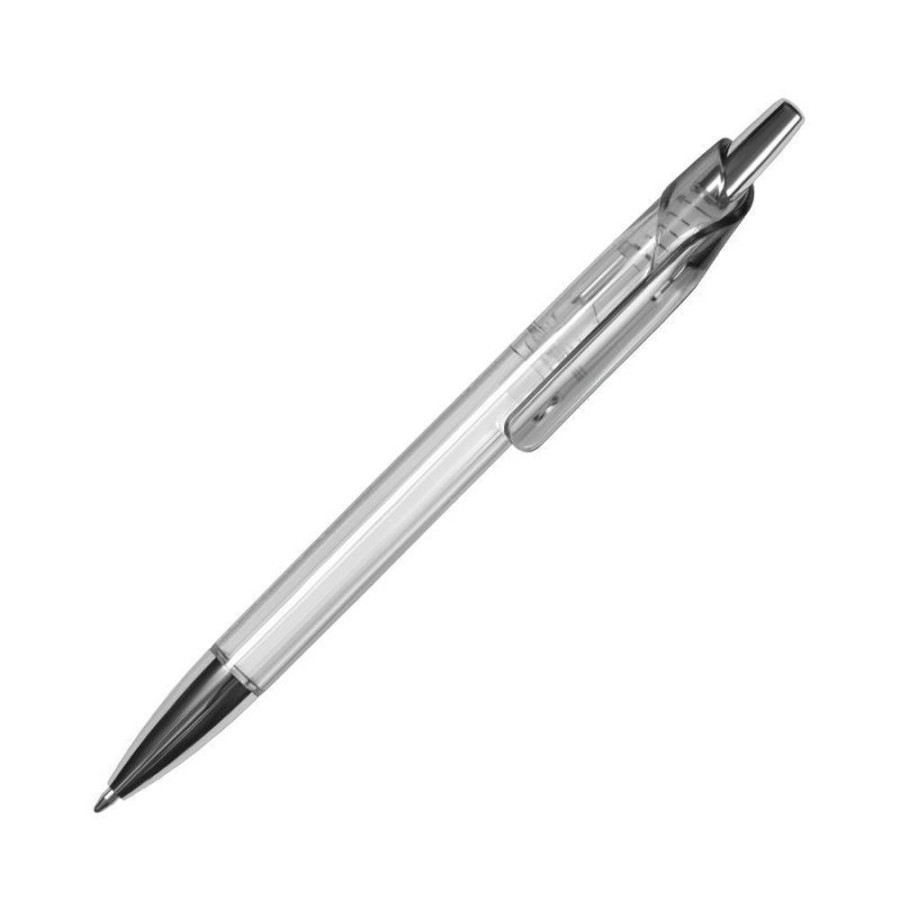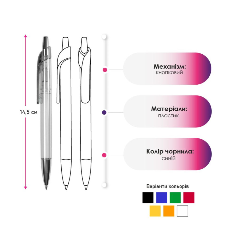 Яскрава кулькова ручка з напівпрозорого глянцевого кольорового пластику, з сріблястим носиком.