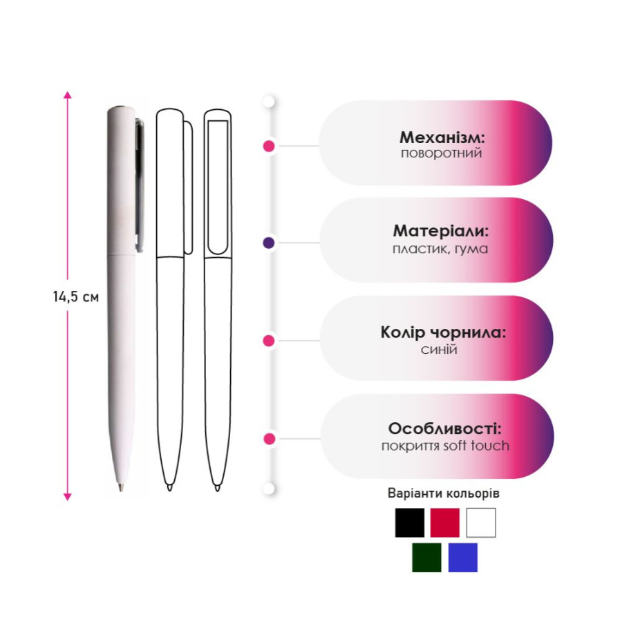 Ручка обладнана пластиковим затискачем сріблястого кольору. За допомогою затискача вона кріпиться в кишені рюкзака чи сумки.