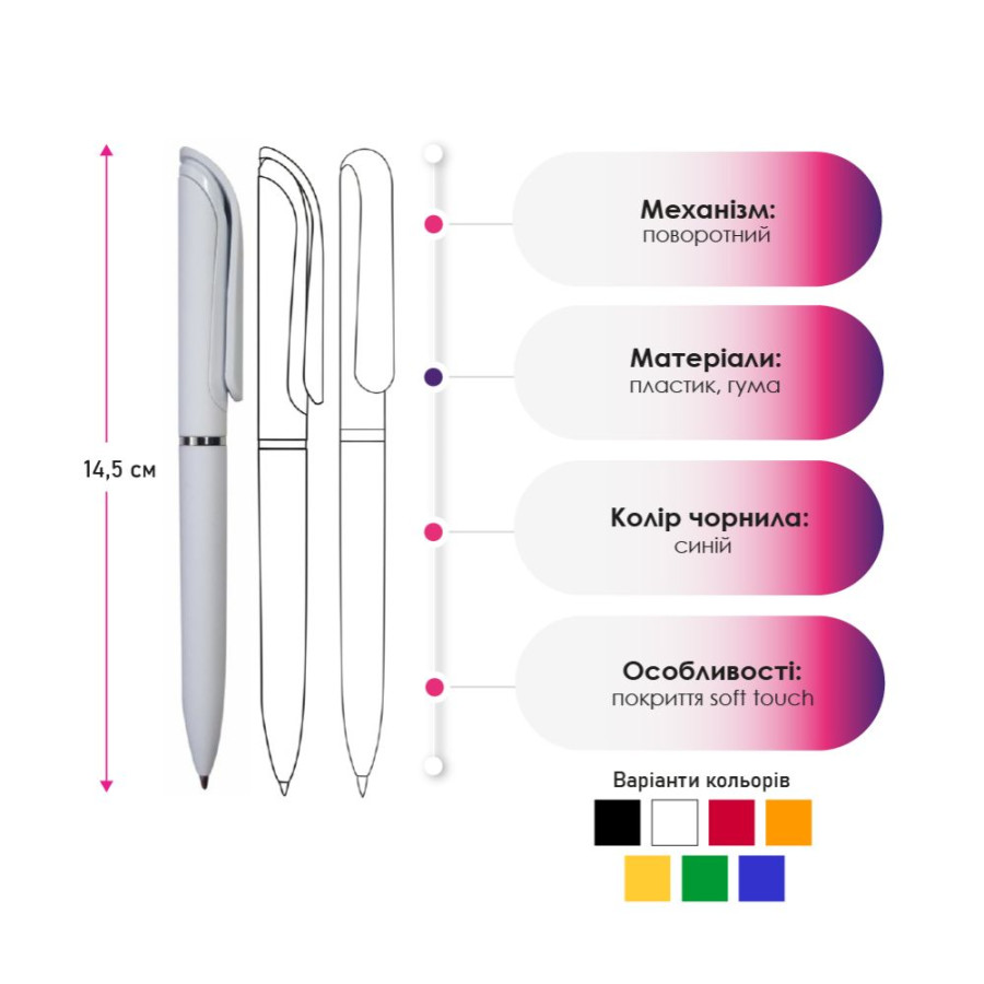 Корпус ручки виготовлений з пластику. Зверху корпус і затискач з покриттям Soft touch. Посередині – металеве хромоване кільце.