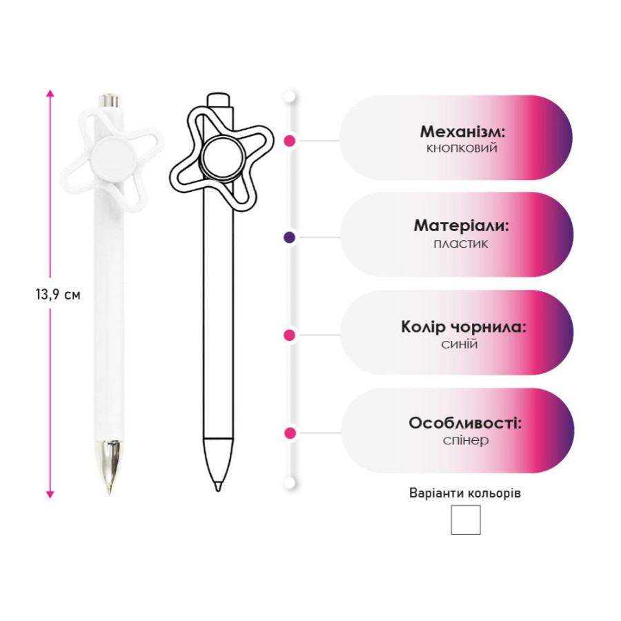 Унікальна, кулькова, автоматична ручка Bergamo SlapkoPen має обертовий елемент - спінер. Брендування можливо як на корпусі, так і в центрі спінера. Носик і кнопка - хромовані. Глянцевий пластик, замінний стрижень. Кнопковий механізм. Колір чорнила - синій.
