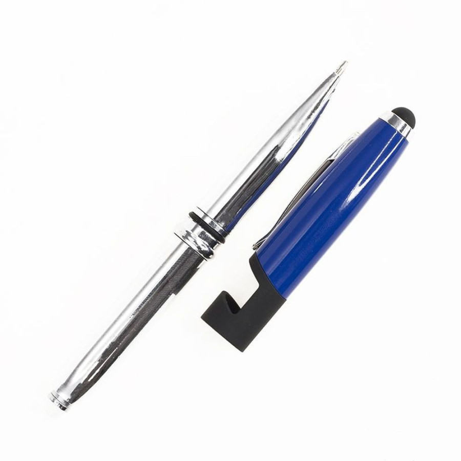 Мультифункціональна ручка - ліхтарик, стилус і тримач для смартфона. Кольоровий металевий лакований ковпачок обладнаний стилусом і тримачем смартфона, ручка виконана з пластика і покрита хромом, на одному кінчику ручці розташований яскравий світлодіодний ліхтарик, зручний для пошуку дрібниць в сумці, скриньці або бардачку машини. Колір гравіювання ковпачка - срібло. 127 мм.