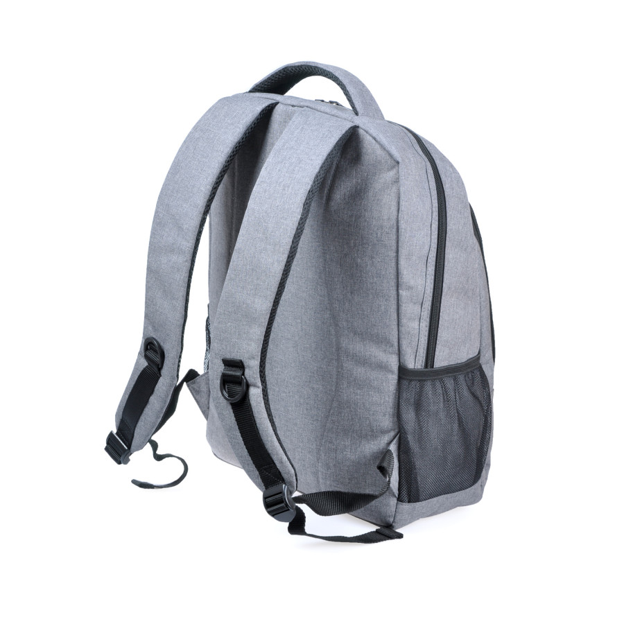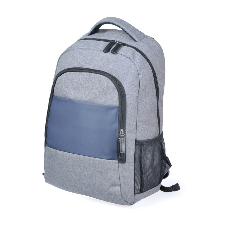 Рюкзак для ноутбука 15''. Має одне велике відділення, з фіксатором для ноутбука, 1 фронтальну кишеню на блискавці та 2 бокові, М'яка спинка, лямки з пасивною системою вентиляції. Ущільнена м'яка підкладка. Розмір синьої вставки: горизонталь - низ 24 см, верх 22 см, вертикаль: 14,4 см. Матеріал: Поліестер під імітацію джута.