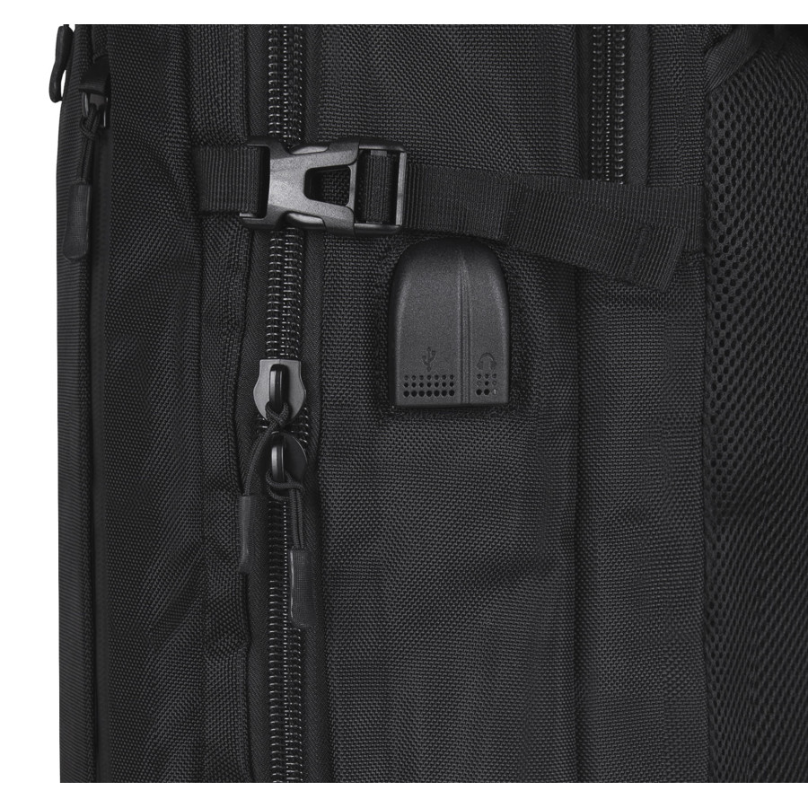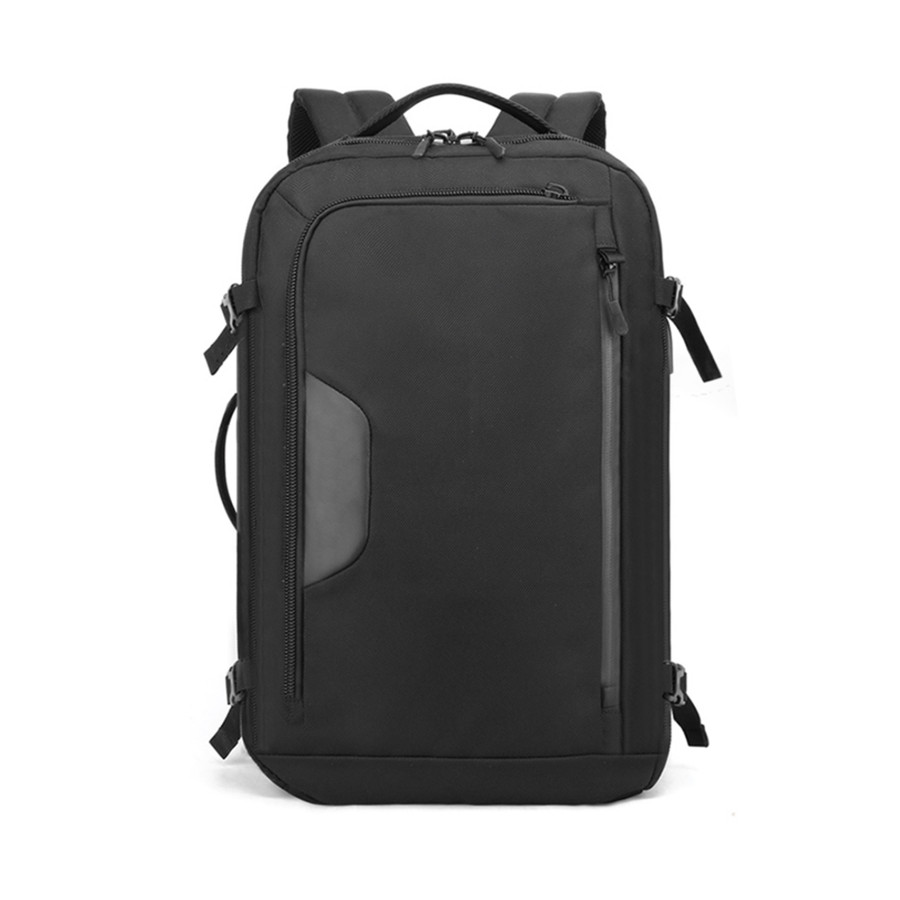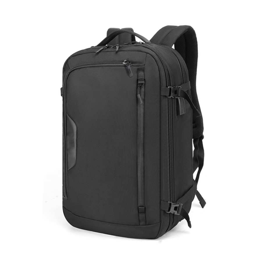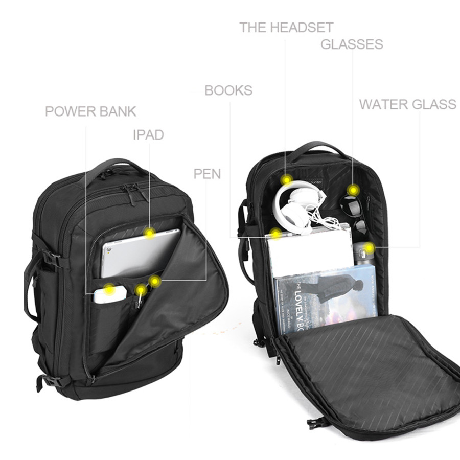 Рюкзак з відділенням для ноутбука 15,6” та відділенням для ipad .Тканина водонепроникний 100% поліестер + PU, має USB Port, великий відділ з еластичними ремінями для одягу та різні кармани-органайзери, прихована кишеня на лямці для карток, бокова кишеня для пляшки, на задній спинці ремінь для валізи. Рюкзак має крім вертикальної ручки горизонтальну і може трансформуватися в сумку, при цьому задні лямки ховаються в приховане відділленя.