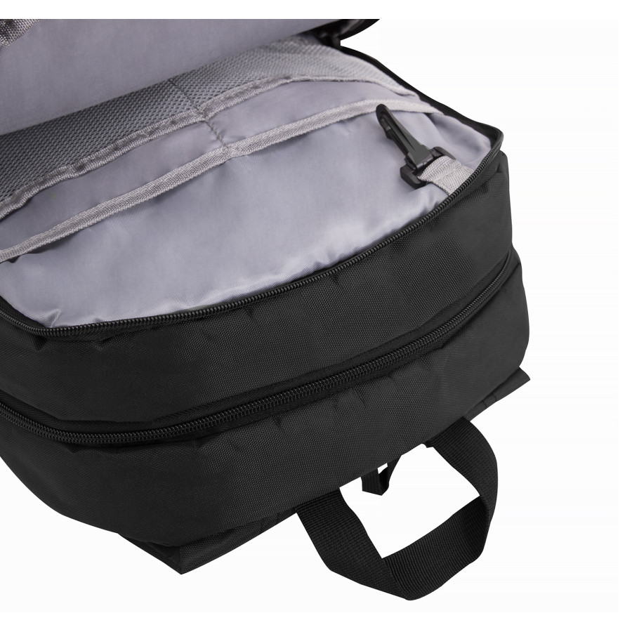 Рюкзак для ноутбука 15,6 дюймів. Одне велике відділення з органайзерами та карабіном для ключів, окреме відділення для ноутбука і окреме для документів, попереду 1 кишеня та 2 відкриті бокові кармани. Ущільнена м'яка підкладка. Поліестер 600D.